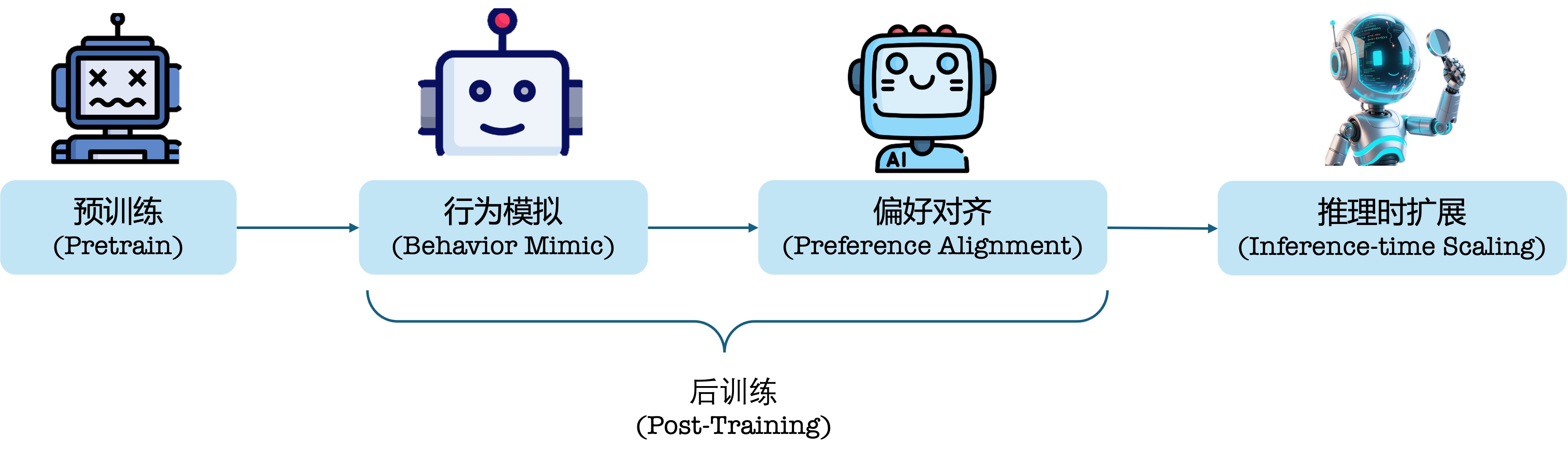 典型的大语言模型(Large Language Model,LLM)管道可以分为如Fig 1.1所示的几部分,其中的行为模拟(Behavior Mimic)通常是通过指令微调(Supervised FineTune, SFT)的方式,使得模型可以从预训练后的续写模型,变为一个可以遵循用户指令进行恰当格式回答的模型,通过偏好对齐(Preference Alignment)能够使得回答更符合人类价值观、意图及特定任务需求。