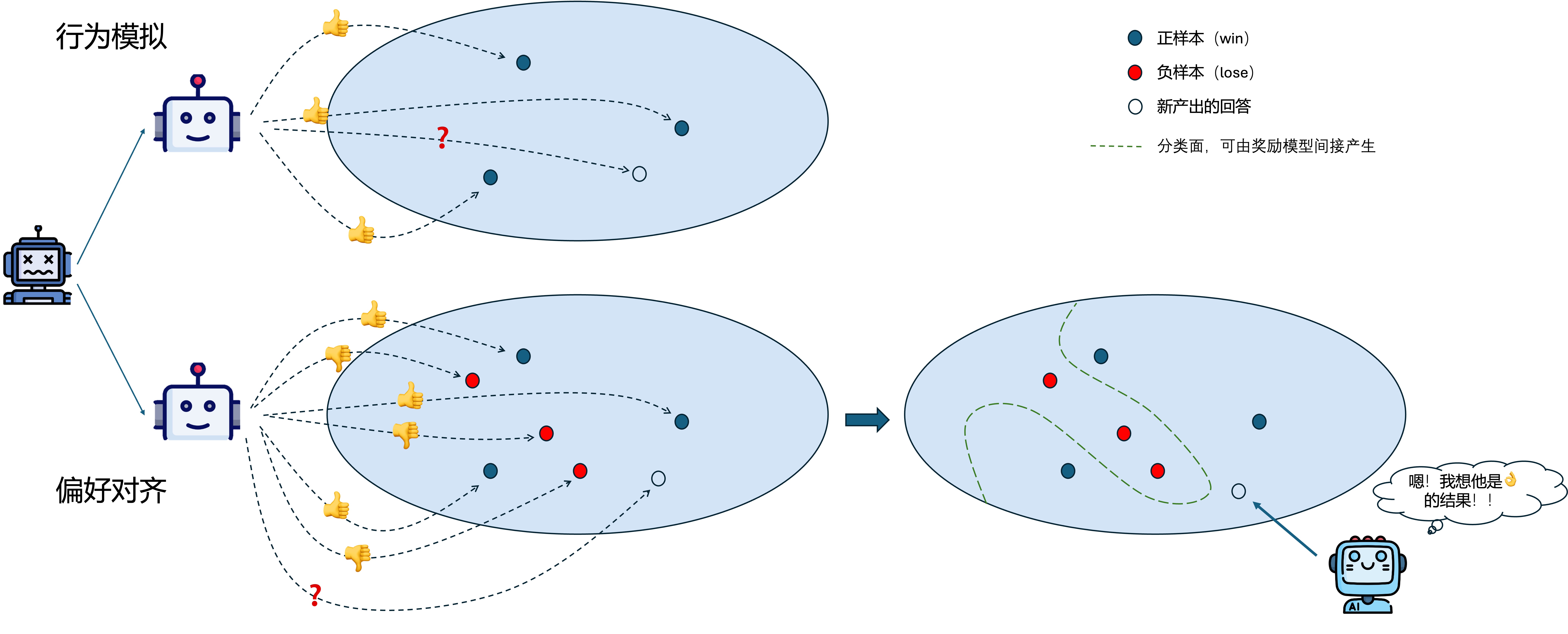 的示例对,给LLM去学习给定了特定任务下的预期回答,相当于是只给定了回答的正例,没有告诉LLM什么样的答案是不可接受的(负例)。此时如果LLM对于训练集外的问题尝试回答,新产生的样本可能会落在负例的区域,表现出来的就是回答出现不符合人类偏好的特性,比如缺失关键信息、出现违反道德法律的内容等等。
