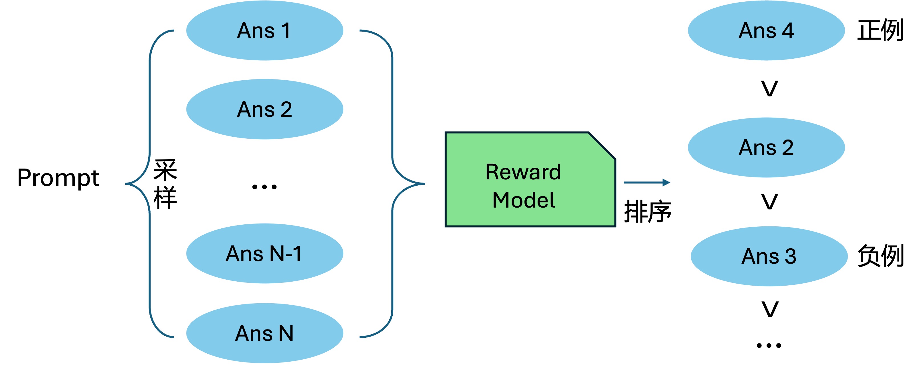 的形式,同时告诉模型哪类型的回答是可接受的,哪类型的回答是不可接受的,这种同时提供正例负例的方式,也可以称之为对比式对齐(Contrastive Alignment)。此处的正例和负例,如果都来自于策略模型本身的采样,那么称之为在轨策略(on-policy),如果其中某个来自于其他模型(比如GPT4)的修正,或者人工标注等非策略模型本身,那么称之为离轨策略(off-policy)。一种常用的正例和负例采样方式,如Fig1.2所示,是采用奖励模型对策略模型的